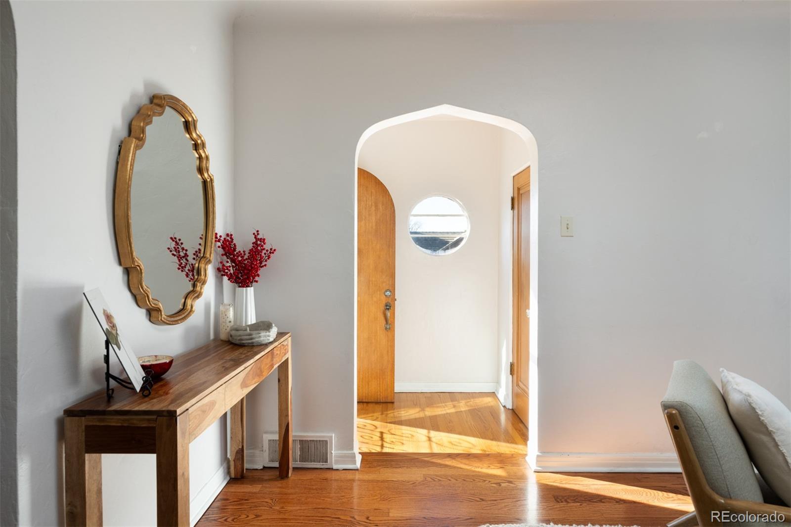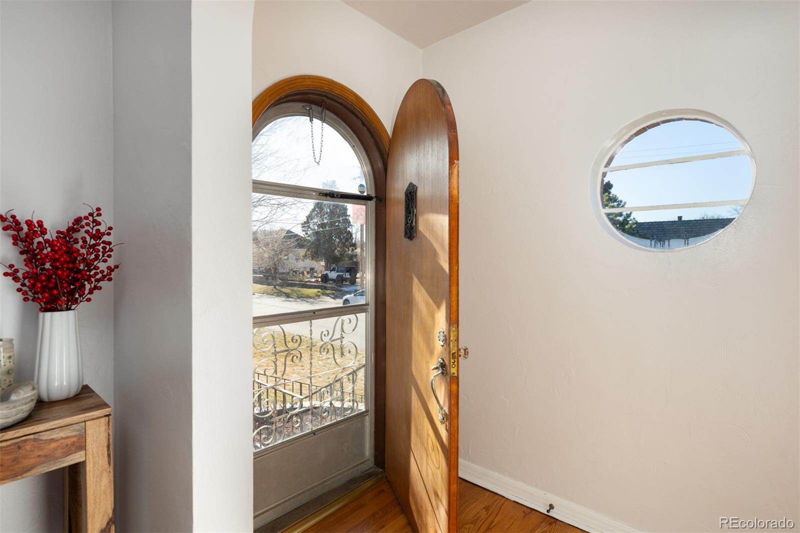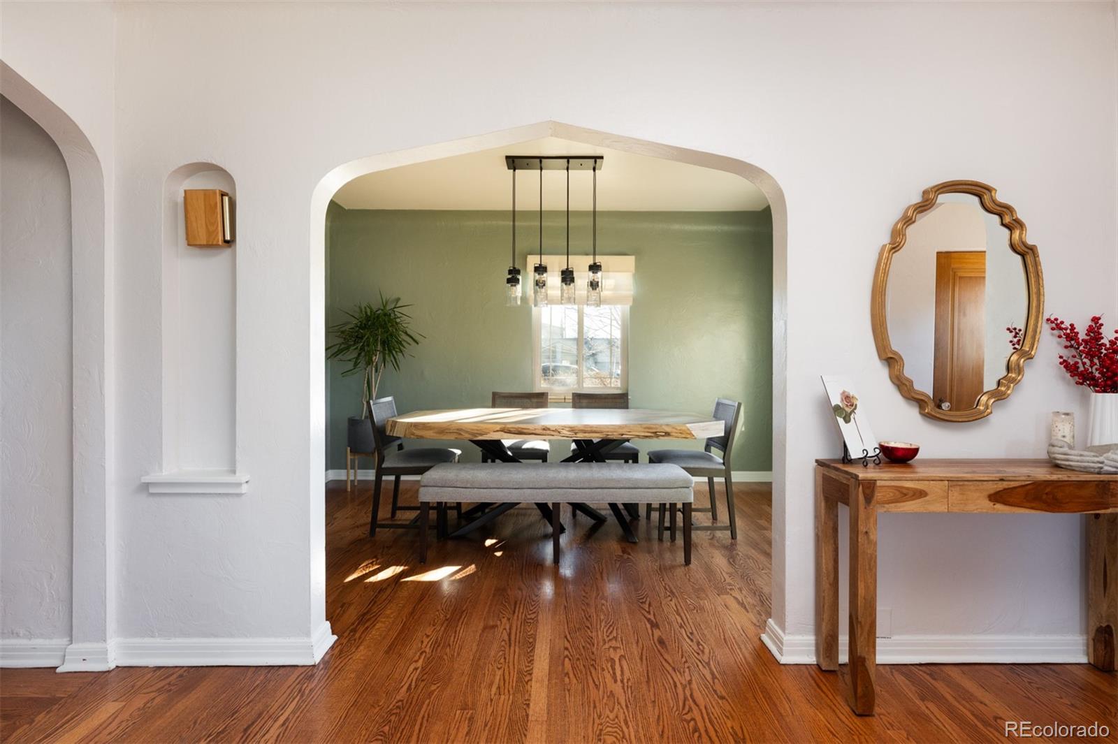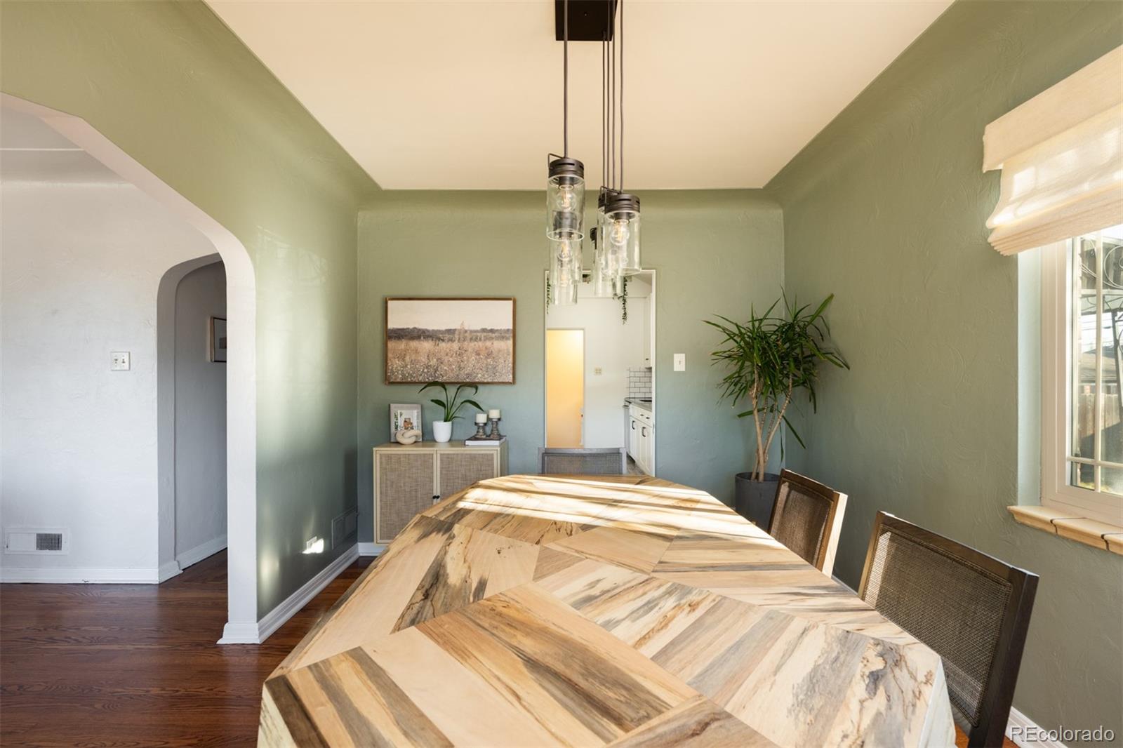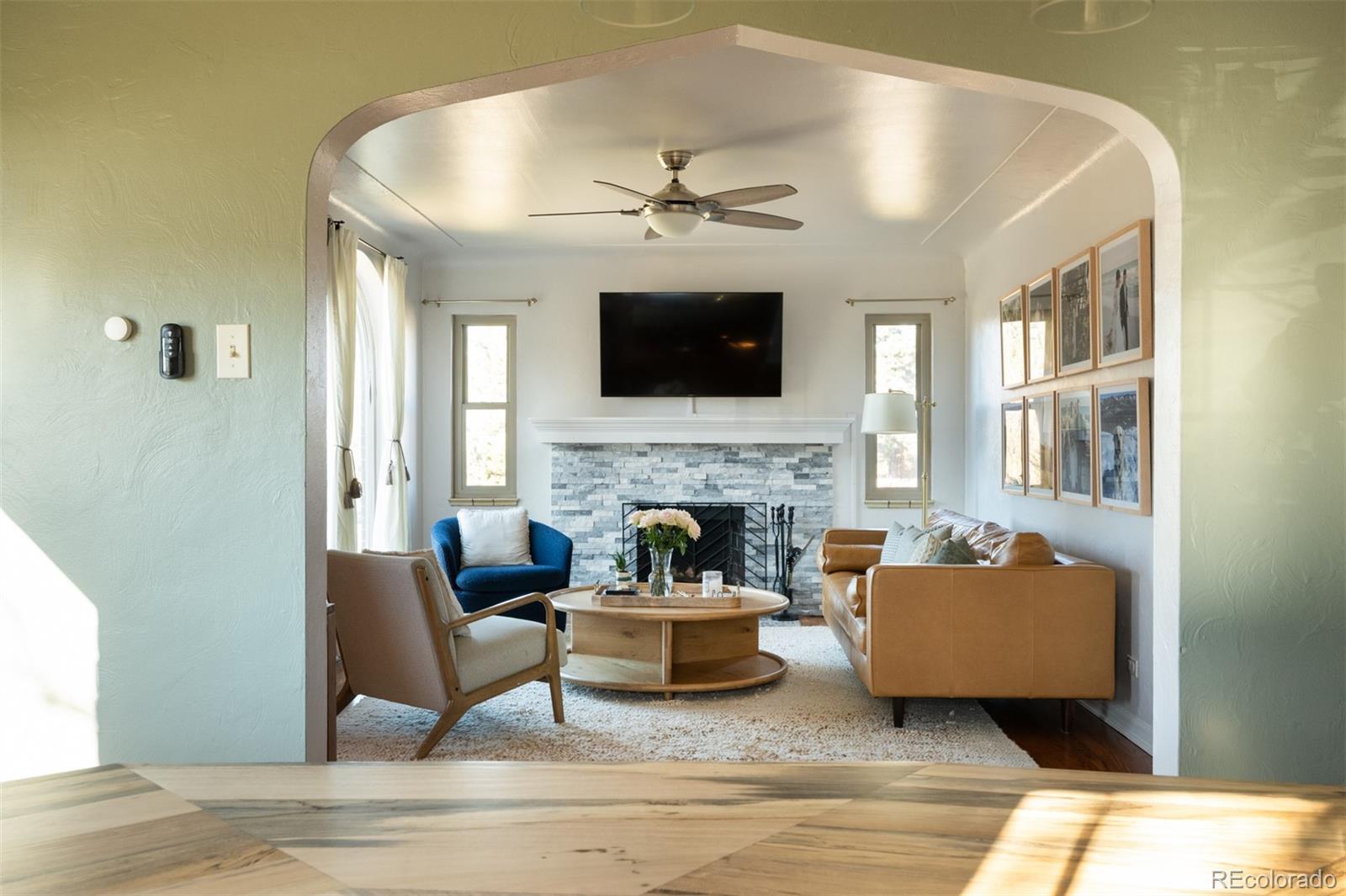Ideally perched in West Highland almost equidistant to both Tennyson Street and Highland Square, this charming 1940 Tudor seamlessly blends old-world charm with modern convenience. Head inside through the arched doorway where you're welcomed by gleaming refinished original hardwood floors and a rare entryway landing with a coat closet. Large west facing windows welcome you to the bright and sunny living room which is anchored by a cozy wood-burning fireplace with new damper and smoke guard. The dining room features south and west facing windows for providing ample natural light and is bordered by original coved ceilings and arched entryways. The updated kitchen boasts vaulted ceilings and tons of countertop space with the perfect blend of cabinetry and open shelving. Downstairs welcomes you with two additional bedrooms--one featuring an expanded closet and egress window--and a beautifully resurfaced 3/4 bath with cast iron tub. A dedicated gym room and an additional family room with cozy carpet provide the perfect spaces for fitness, movie nights with the family, or focused work-from-home time. Step outside to enjoy your private oasis. The fully-fenced backyard features a freshly resodded lawn supported by a well-maintained sprinkler system, providing great opportunities to unwind, garden, or play. A generously sized patio offers the perfect spot for summer barbecues or relaxing evenings under the stars. A detached 2-car garage with new door is the perfect place to store your vehicle or Colorado adventure toys. Modern conveniences like central air conditioning, forced-air heating, and a new washer/dryer with 3 years remaining warranty ensure year-round comfort. Freshly painted throughout including all ceilings and trim, this move-in-ready home is a must-see for anyone seeking a West Highland property with room to make it their own.