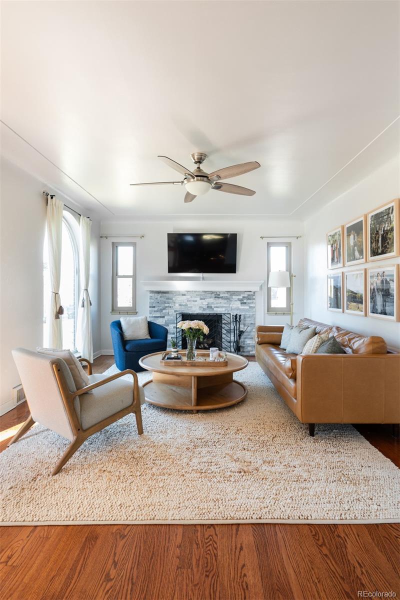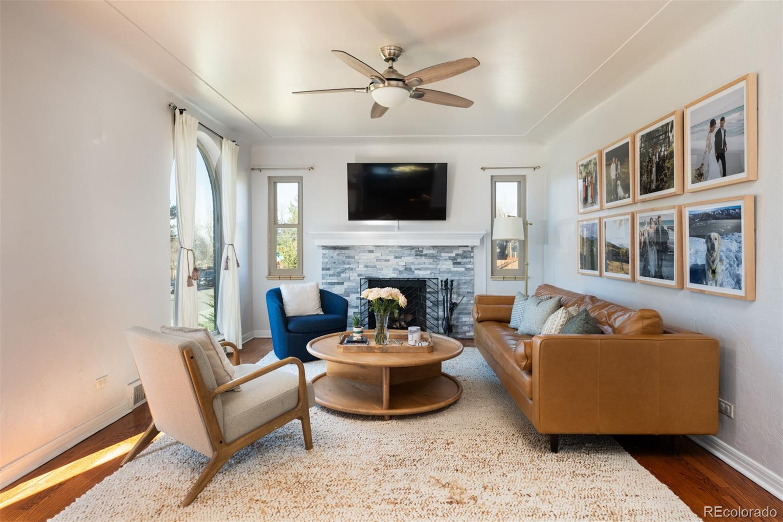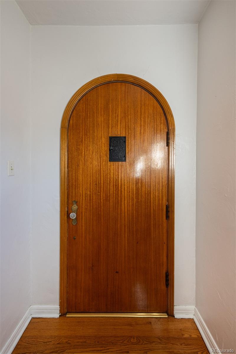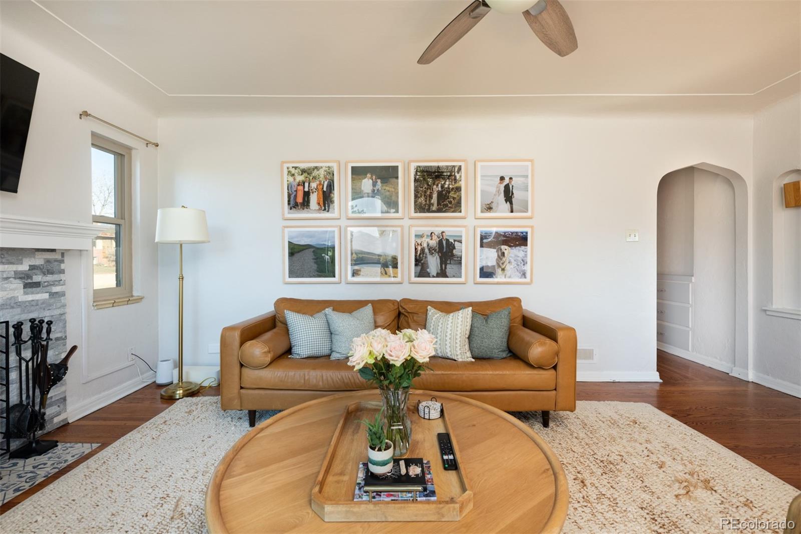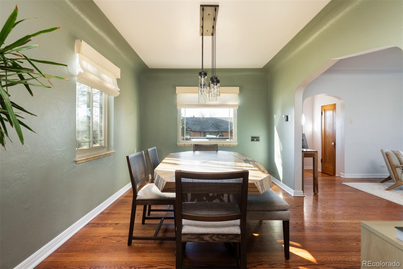 Ideally perched in West Highland almost equidistant to both Tennyson Street and Highland Square, this charming 1940 Tudor seamlessly blends old-world charm with modern convenience. Head inside through the arched doorway where you're welcomed by gleaming refinished original hardwood floors and a rare entryway landing with a coat closet. Large west facing windows welcome you to the bright and sunny living room which is anchored by a cozy wood-burning fireplace with new damper and smoke guard. The dining room features south and west facing windows for providing ample natural light and is bordered by original coved ceilings and arched entryways. The updated kitchen boasts vaulted ceilings and tons of countertop space with the perfect blend of cabinetry and open shelving. Downstairs welcomes you with two additional bedrooms--one featuring an expanded closet and egress window--and a beautifully resurfaced 3/4 bath with cast iron tub. A dedicated gym room and an additional family room with cozy carpet provide the perfect spaces for fitness, movie nights with the family, or focused work-from-home time. Step outside to enjoy your private oasis. The fully-fenced backyard features a freshly resodded lawn supported by a well-maintained sprinkler system, providing great opportunities to unwind, garden, or play. A generously sized patio offers the perfect spot for summer barbecues or relaxing evenings under the stars. A detached 2-car garage with new door is the perfect place to store your vehicle or Colorado adventure toys. Modern conveniences like central air conditioning, forced-air heating, and a new washer/dryer with 3 years remaining warranty ensure year-round comfort. Freshly painted throughout including all ceilings and trim, this move-in-ready home is a must-see for anyone seeking a West Highland property with room to make it their own.