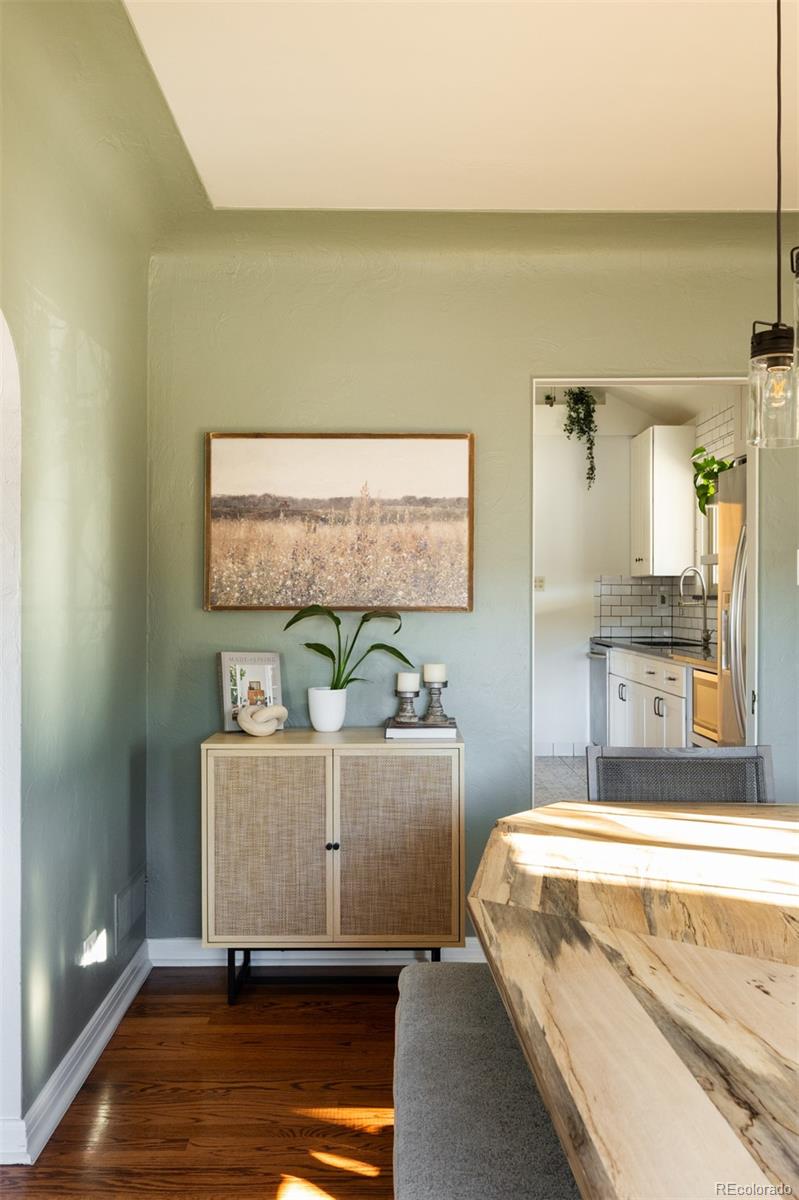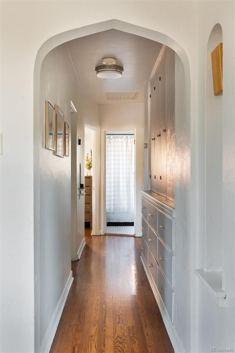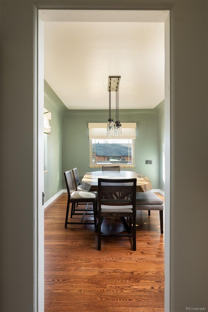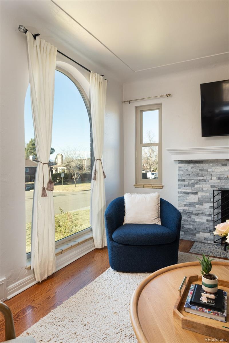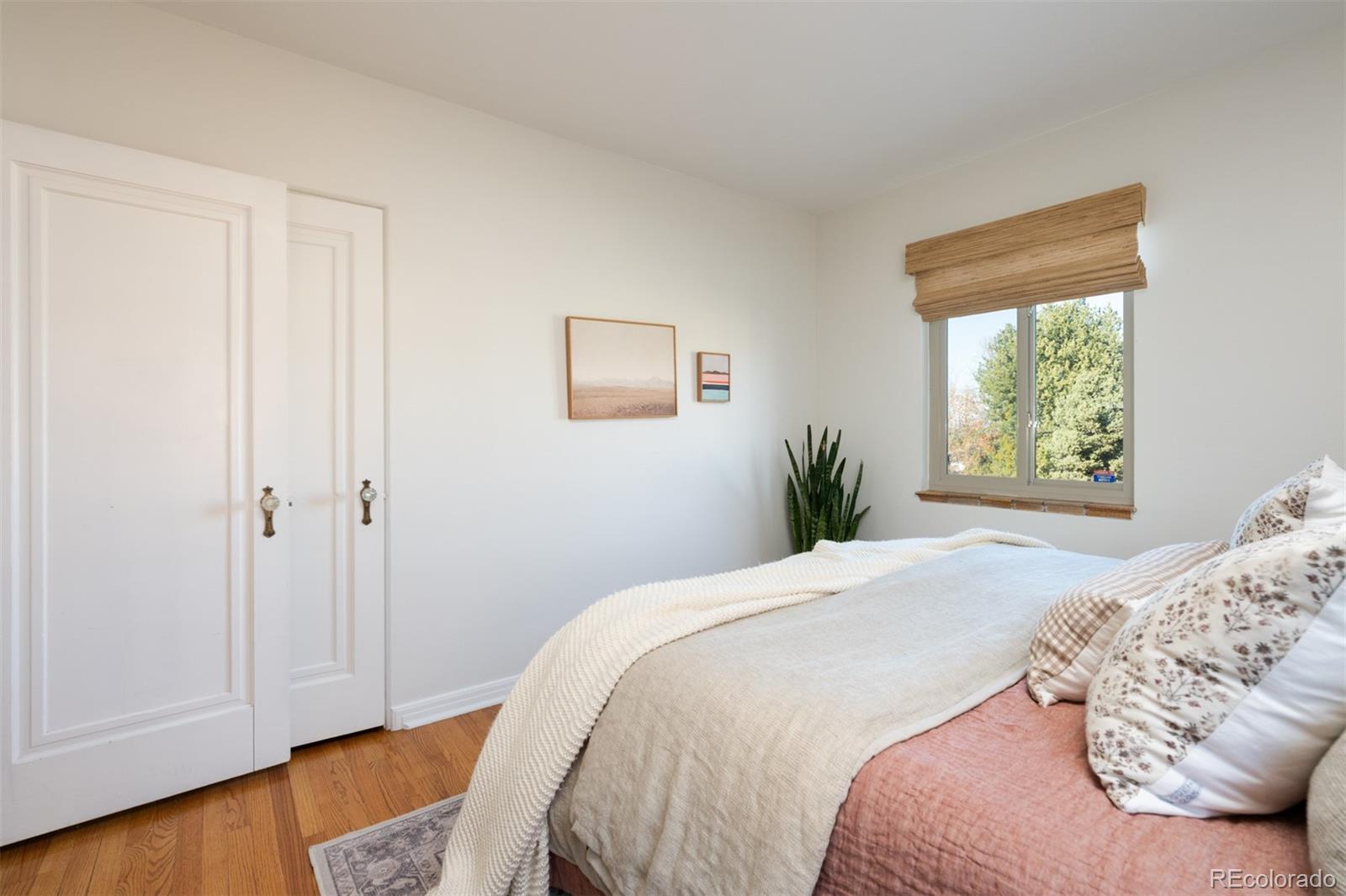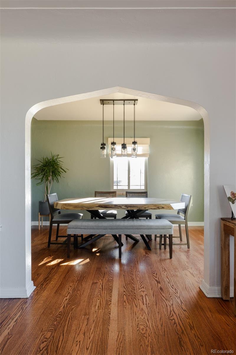 Ideally perched in West Highland almost equidistant to both Tennyson Street and Highland Square, this charming 1940 Tudor seamlessly blends old-world charm with modern convenience. Head inside through the arched doorway where you're welcomed by gleaming refinished original hardwood floors and a rare entryway landing with a coat closet. Large west facing windows welcome you to the bright and sunny living room which is anchored by a cozy wood-burning fireplace with new damper and smoke guard. The dining room features south and west facing windows for providing ample natural light and is bordered by original coved ceilings and arched entryways. The updated kitchen boasts vaulted ceilings and tons of countertop space with the perfect blend of cabinetry and open shelving. Downstairs welcomes you with two additional bedrooms--one featuring an expanded closet and egress window--and a beautifully resurfaced 3/4 bath with cast iron tub. A dedicated gym room and an additional family room with cozy carpet provide the perfect spaces for fitness, movie nights with the family, or focused work-from-home time. Step outside to enjoy your private oasis. The fully-fenced backyard features a freshly resodded lawn supported by a well-maintained sprinkler system, providing great opportunities to unwind, garden, or play. A generously sized patio offers the perfect spot for summer barbecues or relaxing evenings under the stars. A detached 2-car garage with new door is the perfect place to store your vehicle or Colorado adventure toys. Modern conveniences like central air conditioning, forced-air heating, and a new washer/dryer with 3 years remaining warranty ensure year-round comfort. Freshly painted throughout including all ceilings and trim, this move-in-ready home is a must-see for anyone seeking a West Highland property with room to make it their own.