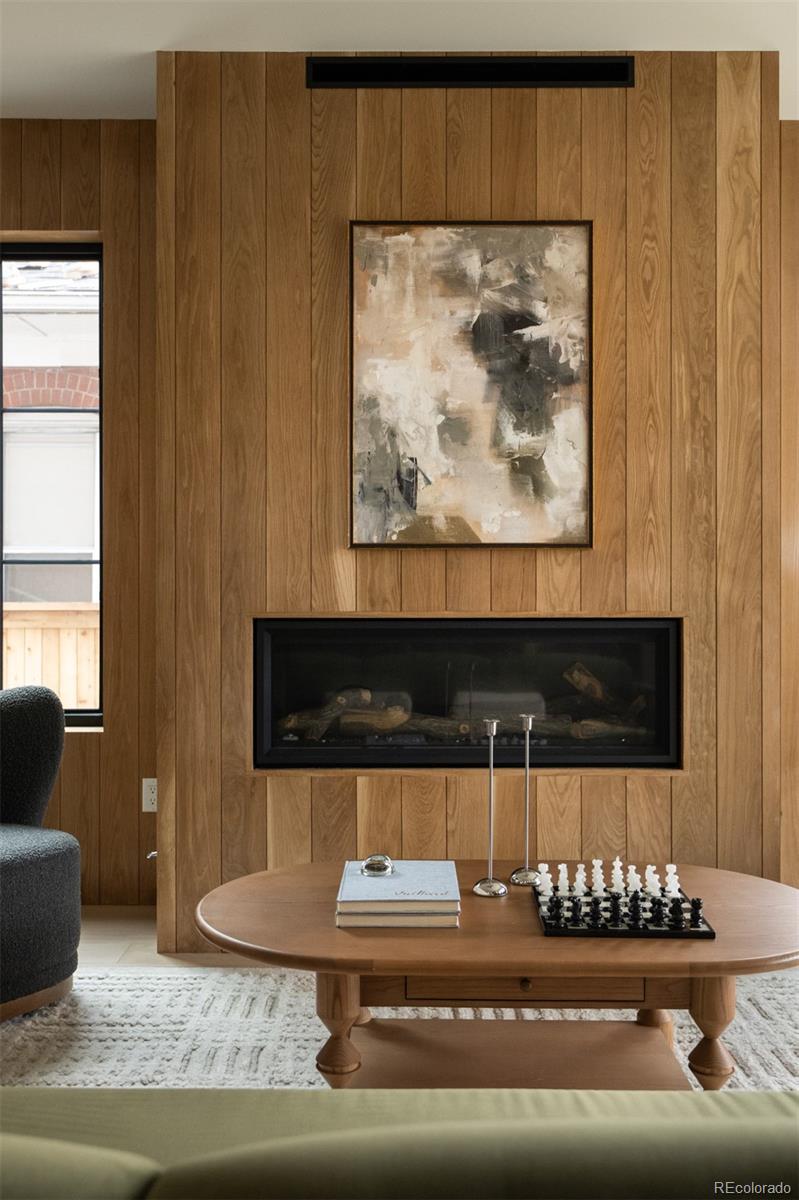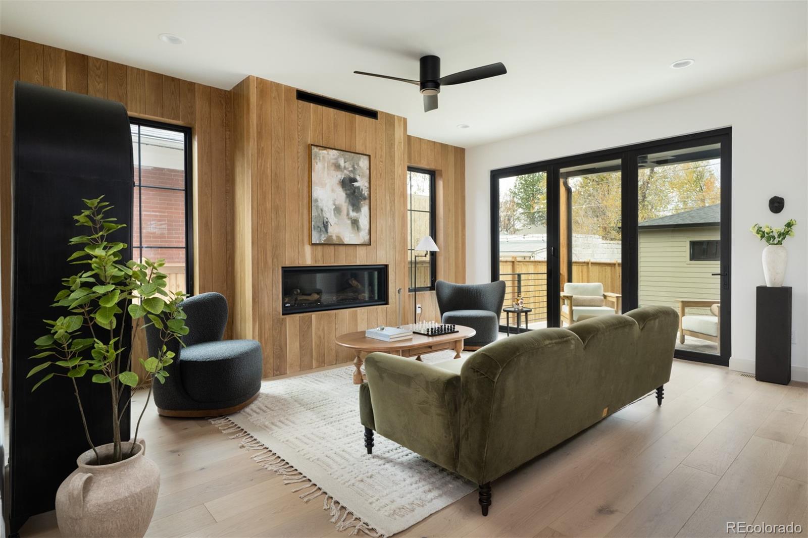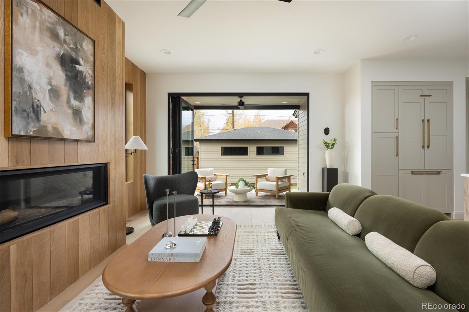 Upon entering, you'll be captivated by a blend of defined spaces and open-concept design that emphasizes flow and functionality. Designer lighting and high-end plumbing fixtures accentuate the tranquil interiors, while the expansive kitchen, complete with a Thermador appliance suite and quartz countertops, invites culinary exploration. The living area, anchored by a gas fireplace and white oak accent panel wall system extends to a covered patio, facilitating a harmonious indoor-outdoor living experience.
